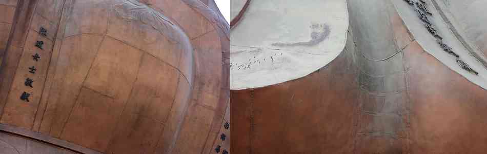| 1998年完成 高さ 61.9m、 蓮台座 14.9m + 観音坐像 47m 銅鍛造 ![]() 観音坐像は、、北向きなので、、正面からだと 完全な逆光となる。 夏場で、太陽が高い位置にあれば逆光も軽度なのだが、、 3月初めでは、、こんな逆光写真しか撮れない。 カメラの逆光補正のHDR機能も全く効果は無い。 ![]() 壮大な光景は、、漢民族の得意とする 設計能力だ。 観音聖水に架かる石橋、、、観音像は遥か奥に、天空に、、聳えている。 ![]() 人間はとても小さい。 ![]() 途中から振り返る。 ↓ 観音聖水と 照壁、、、牌楼門 ↓ ![]() 遥か天空に 観音像、、、威厳の演出は極めている。 ![]() ![]() 石レリーフの立体感、、精緻さは 特筆すべき労作だ。 ![]() ![]() 逆光を避ける為に、、やや斜めから、、、 ![]() 観音像直下から、、下界を振り返る。 ![]() ![]() ![]() この位置で、、、銅鍛造、、、を実感する。 鋳造ではなく、、鍛造、、、 銅版の張りぼてなのだ〜! 世界最大と言っても、、張りぼてでは、、全く自慢にはならない。 ![]() ![]() 南海観音坐像の蓮台の中に入れる。